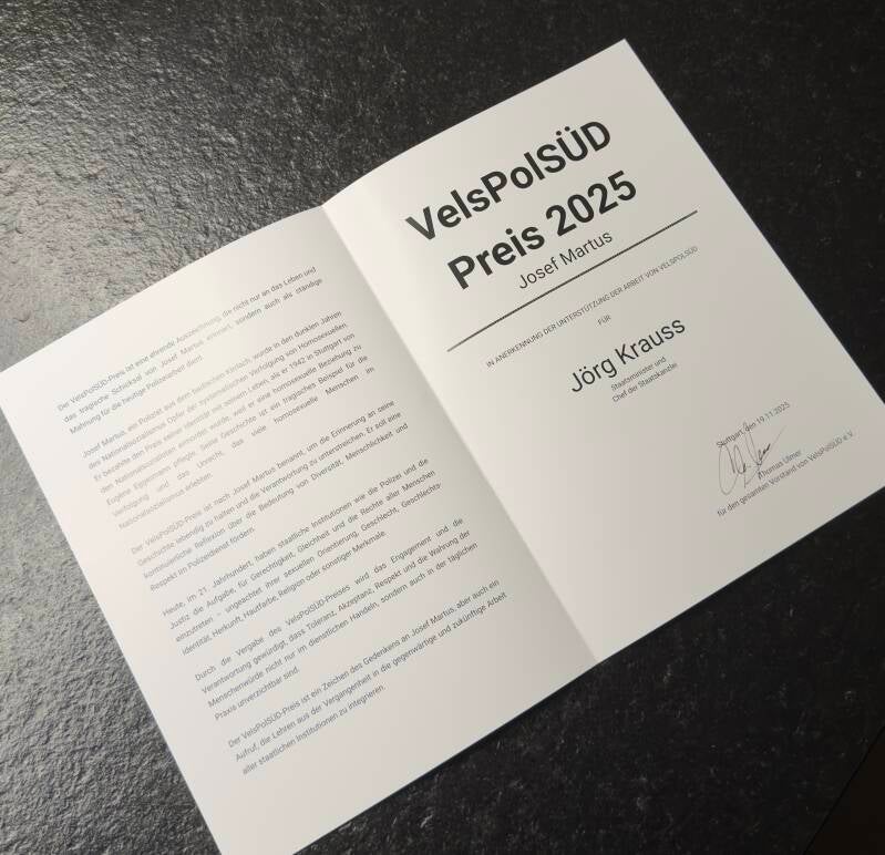 Der VelsPolSÜD-Preis ist eine ehrende Auszeichnung, die nicht nur an das Leben und das tragische Schicksal von Josef Martus erinnert, sondern auch als ständige Mahnung für die heutige Polizeiarbeit dient.